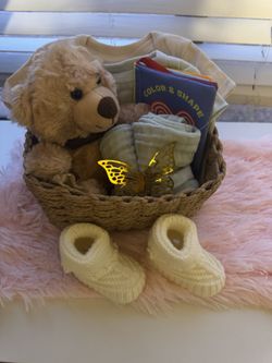 Baby Gift Basket – Handmade Booties, Burp Towels & Plush Bear (Neutral Colors)$25Mesa, AZ