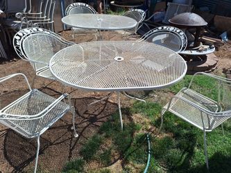Two 54 x 42 oval wrought iron mesh patio tables with total of 6 chairs. $375Phoenix, AZ