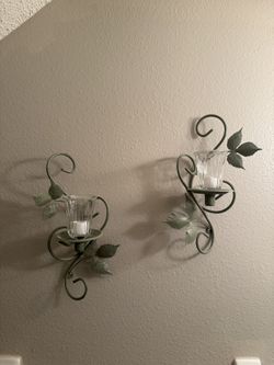 pair of vintage Homco or Home Interiors green metal wall sconces with leaf accents and glass votive cups$25Town 'n' Country, FL