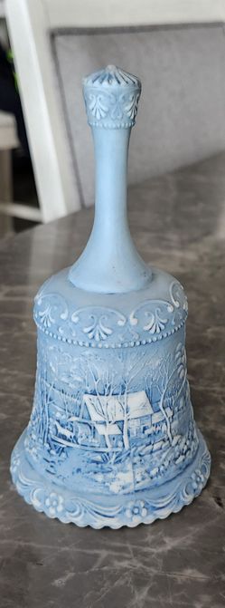 Vintage 1980s Soft Blue Fenton Blue Currier & Ives Winter Country Village Scene Horses $10Lake Elsinore, CA